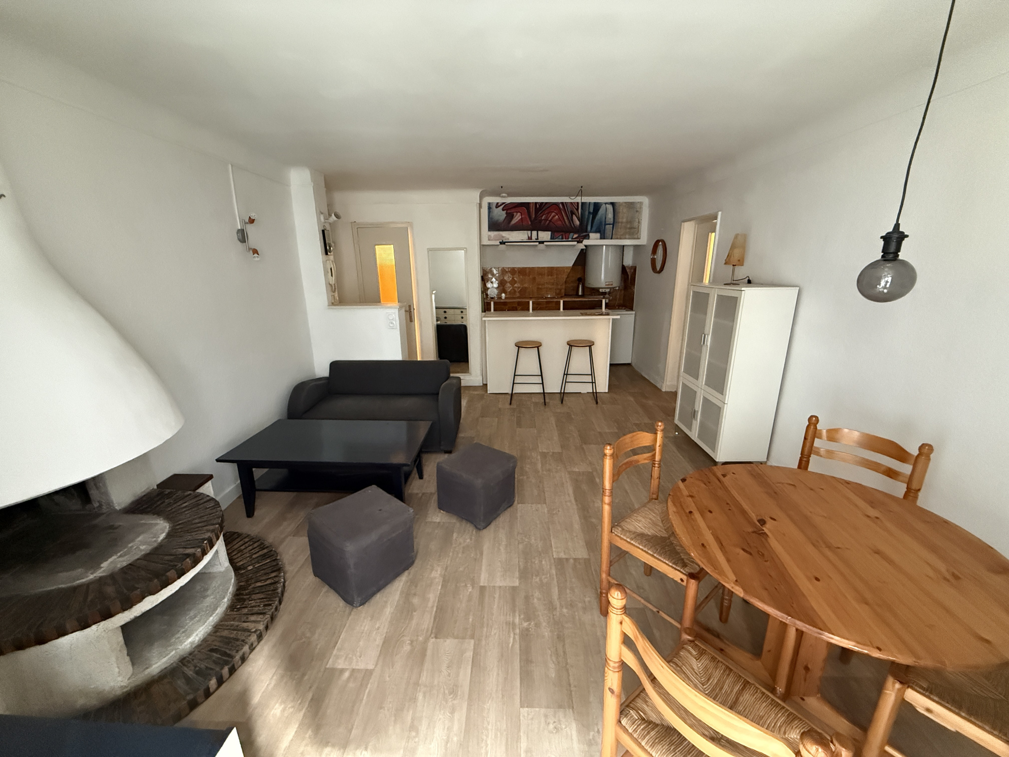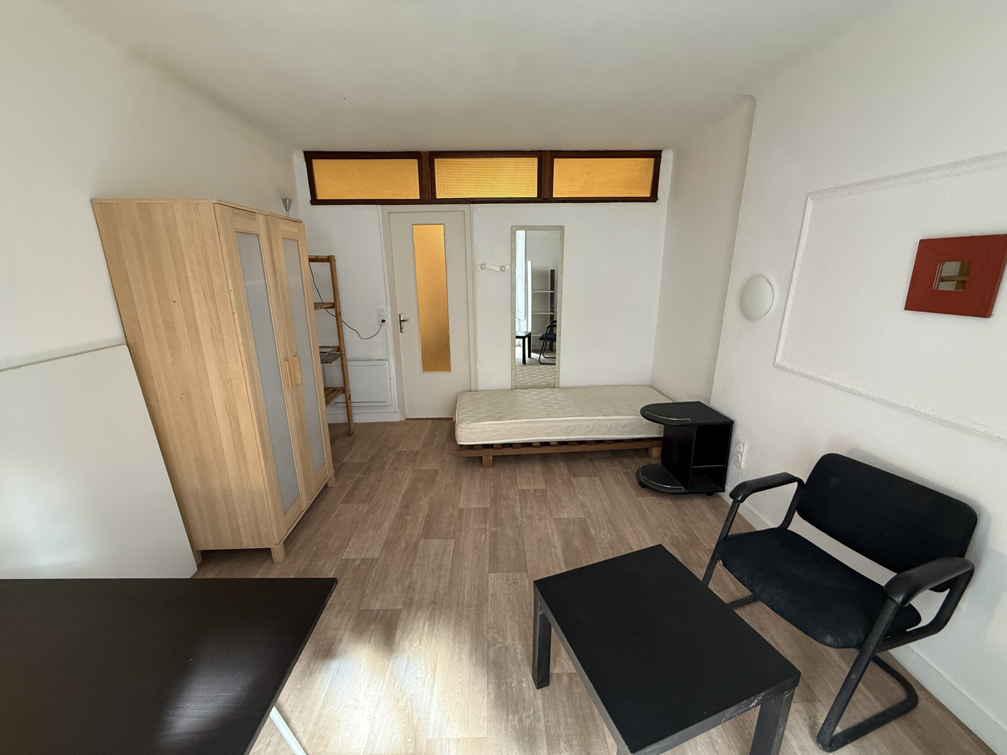 Un salon-séjour, une salle d'eau avec WC, un bureau et une chambre.